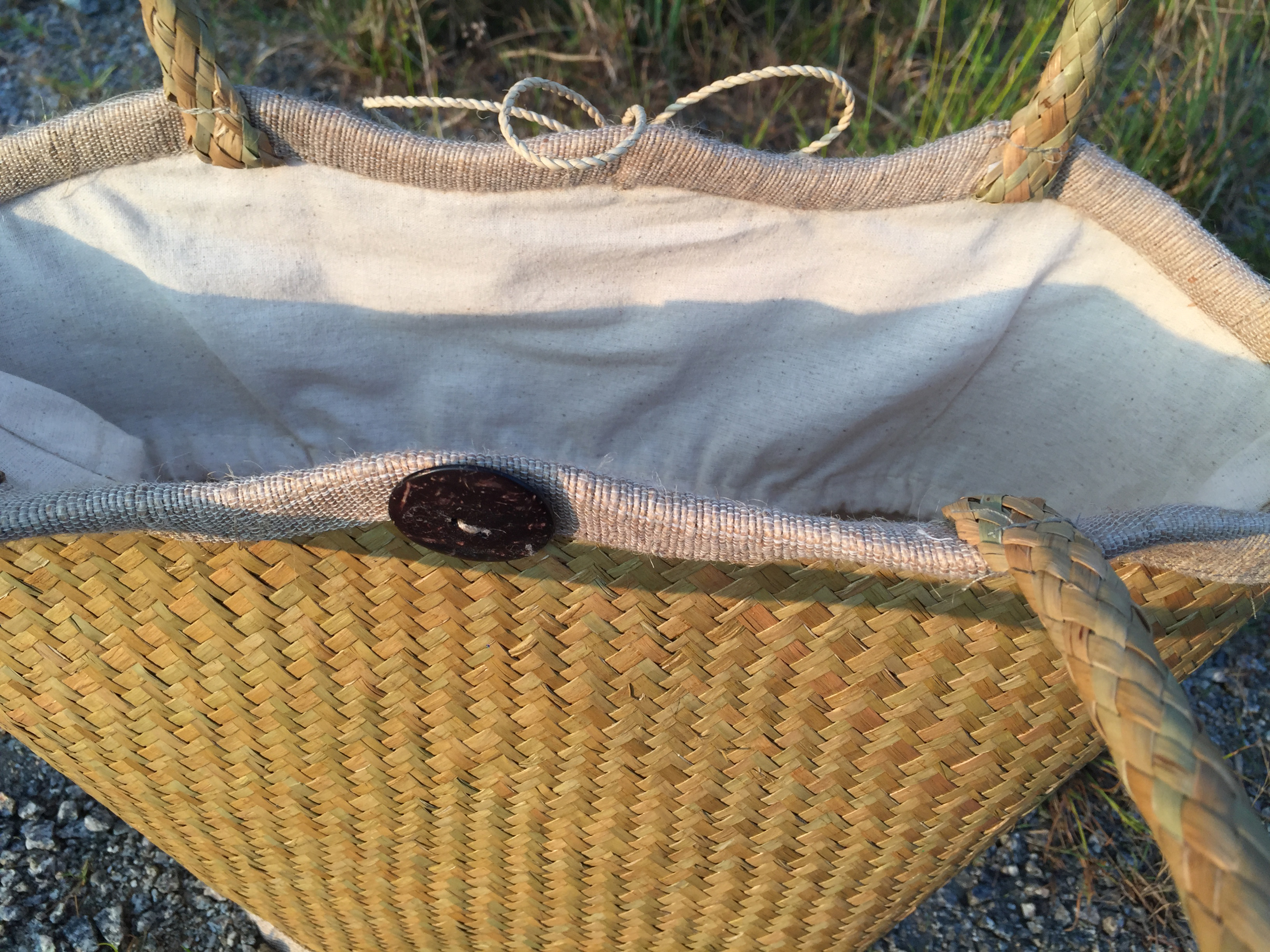 - Lớp bên ngoài được đan chắc chắn bằng cỏ bàng, những đường đan chi tiết tỉ mỉ, được làm thủ công bởi các nghệ nhân là người dân địa phương. Vì lớp ngoài là lớp cỏ khô nên nó rắn chắc, đàn hồi tốt, được thiết kế để làm bộ khung cho giỏ. Đường chỉ may ngay ngắn, ngăn nắp, đồng đều. Màu chỉ được lựa chọn, hài hoà với tổng thể màu của giỏ, không bị chõi màu. Cho nên, lớp vỏ ngoài của giỏ được ví như người phụ nữ Việt Nam rắn rỏi. Đồng thời, hai bên còn được đính kèm nút và dây, sử dụng để cài lại để vật để trong giỏ không bị rơi ra.